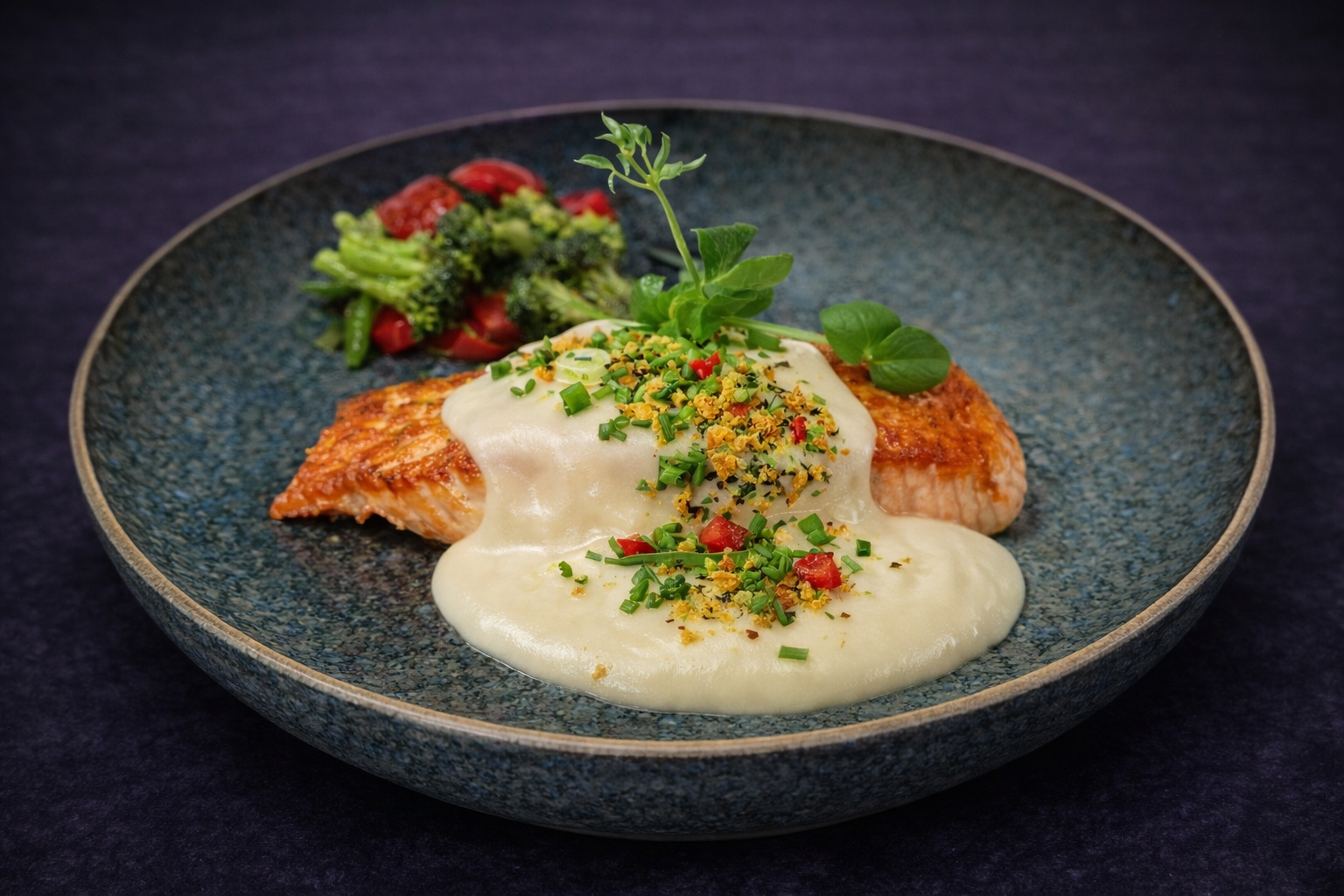 Gebakken zalmfilet 200 gram met witte wijnsaus en groene kruidencrumble
