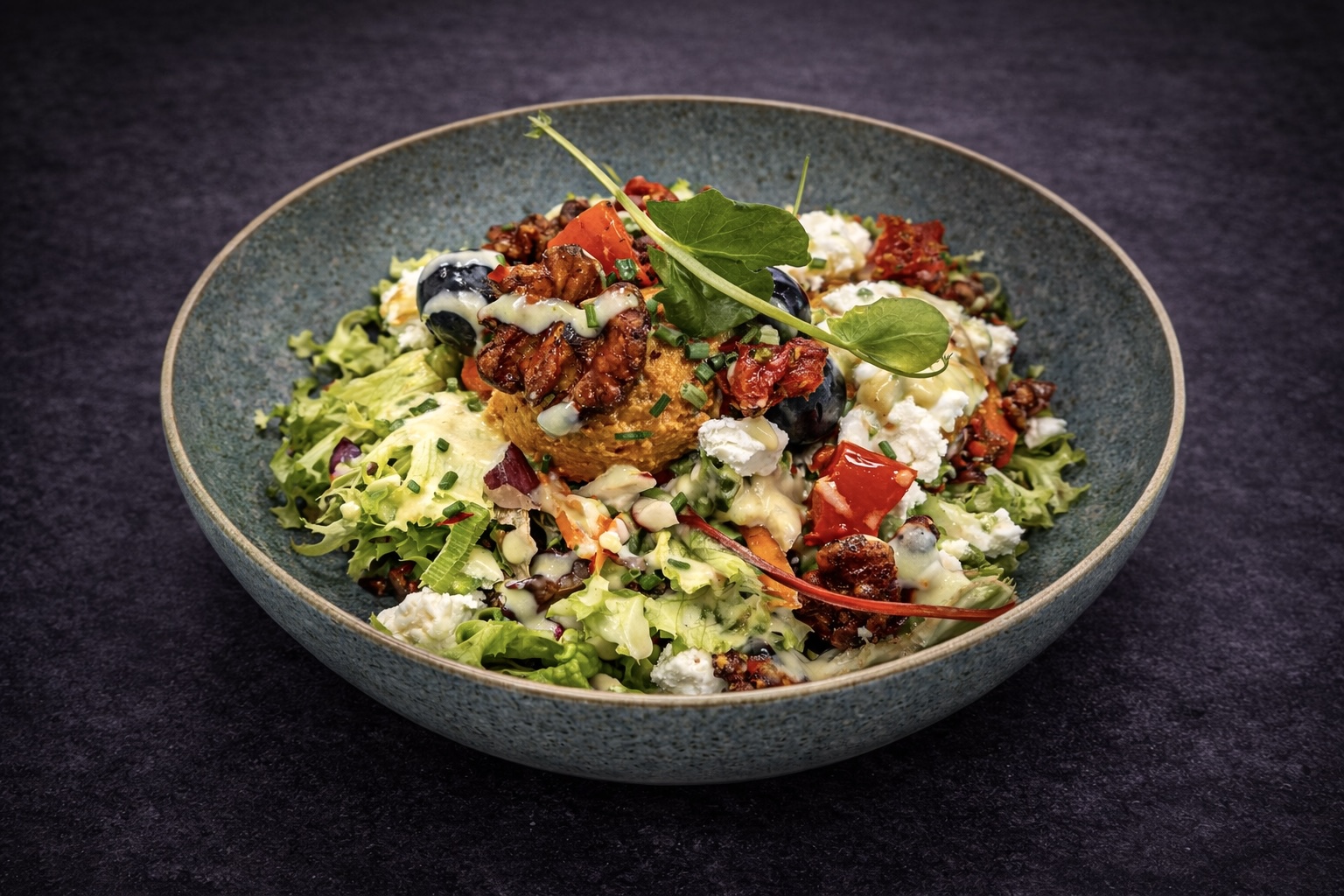 Sla mix, rauwkost, brie, geitenkaas, blauwe bessen, cerise tomaatjes, gesuikerde walnoten en truffelhoning