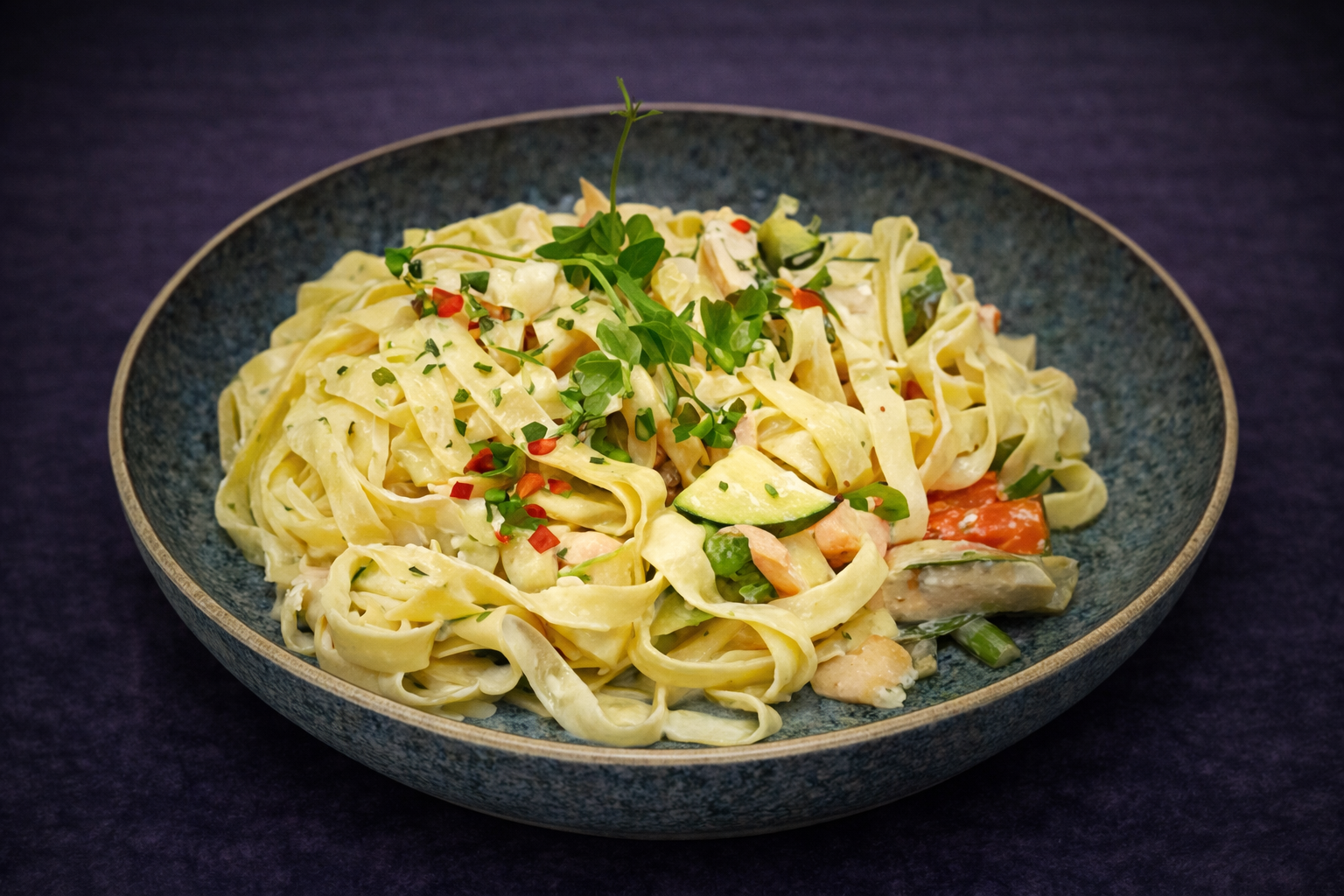 Fettuccine met huisgemarineerde zalm, roomsaus en verse groenten