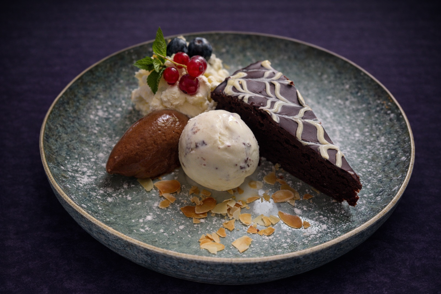 Huisgemaakte chocoladetaart, chocolademousse, bol stracciatella-ijs en verse slagroom